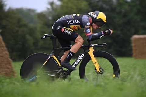 | Le Slovène Primoz Roglic lors de la 5e étape du Tour de France, un contre-la-montre entre Change et Laval, le 30 juin. |