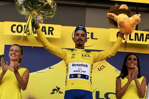 | Le Français Julian Alaphilippe toujours en jaune après la 5e étape du Tour de France, le 10 juillet à Colmar. |