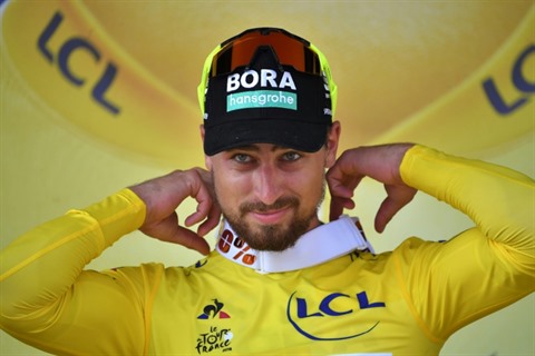| Le Slovaque Peter Sagan vainqueur de la 2e étape et maillot jaune lors de la 105e édition du Tour de France le 8 juillet. |