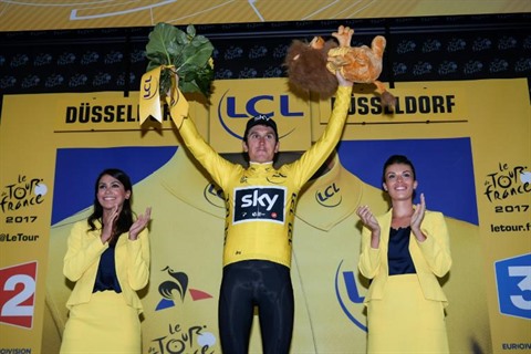 | Geraint Thomas endosse le maillot jaune à l'issue de la première étape du Tour de France à Düsseldorf, le 1er juillet. |