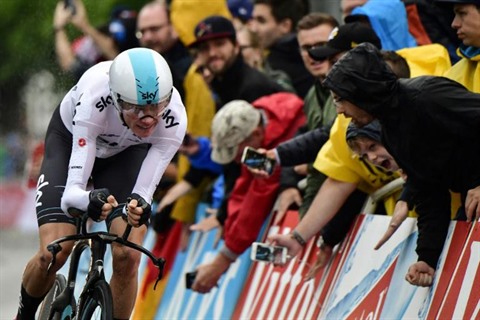 | Le leader de la Sky Chris Froome lors du contre-la-montre, 1re étape du Tour de France à Düsseldorf, le 1er juillet. |