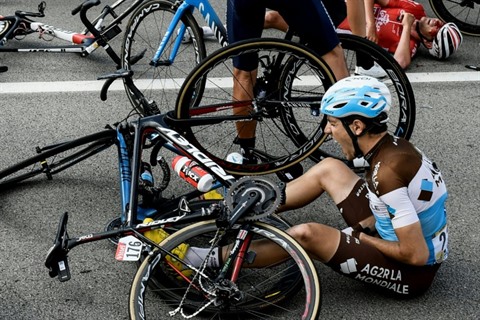| Le Français Axel Domont se fracture la clavicule droite lors de la 4e étape du Tour de France le 10 juillet. |