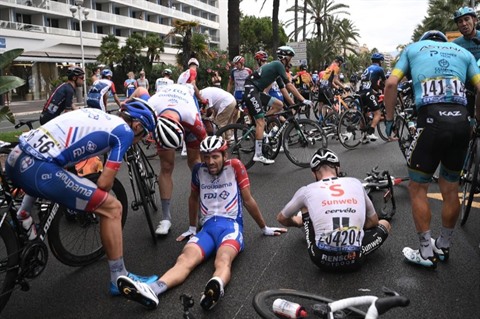 Par précaution, les temps ont été neutralisés au passage des trois derniers kilomètres, suivant une décision du jury qui a accédé à la demande des coureurs mis en garde par des chutes lors des deux premiers passages sur la Promenade des Anglais. Cette mesure a "sauvé" Pinot pris dans un empilage massif, avec plusieurs coéquipiers, aussitôt après le passage sous la banderole des 3 kilomètres.