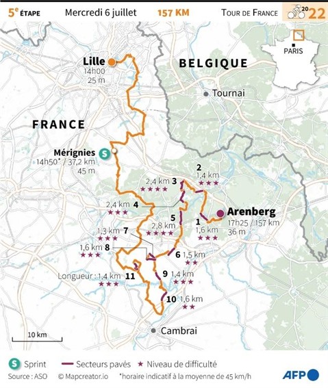 Le maillot jaune comme les leaders devront éviter chutes et crevaison sur ce tracé de 157 km aux airs de Paris-Roubaix, car parsemé de 19,4 km de pavés, dont quatre secteurs habituels de la reine des classiques.
