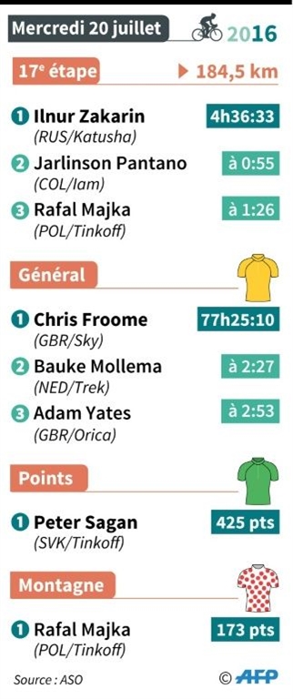 Pour le gain de l'étape, Zakarin, membre d'une échappée partie bien avant les 100 derniers kilomètres, a précédé le grimpeur colombien Jarlinson Pantano, vainqueur dimanche 17 juillet de l'étape du Grand Colombier, de 55 secondes et le Polonais Rafal Majka, porteur du maillot à pois, de près d'une minute et demie.