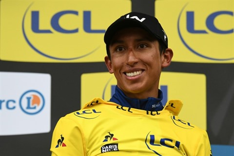 | Le Colombien Egan Bernal vainqueur de Paris-Nice au terme de la 8e et dernière étape, le 17 mars à Nice. |