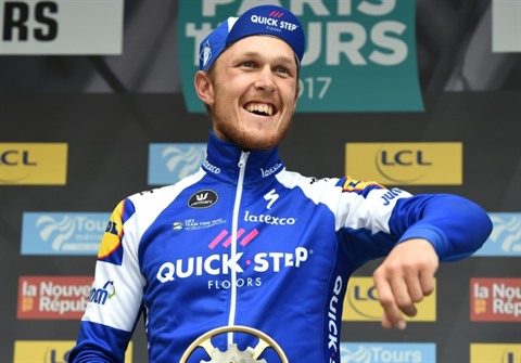 | L'Italien Matteo Trentin alors dans l'équipe Quick Step, vainqueur de Paris-Tours, le 8 octobre 2017. |