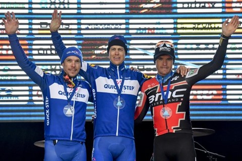 | Les Belges Philippe Gilbert (droite) et Greg Van Avermaet (gauche) encadrent le vainqueur néerlandais Niki Terpstra lors de la 61e édition de l'"E3 Prijs Vlaanderen Harelbeke", le 23 mars. |