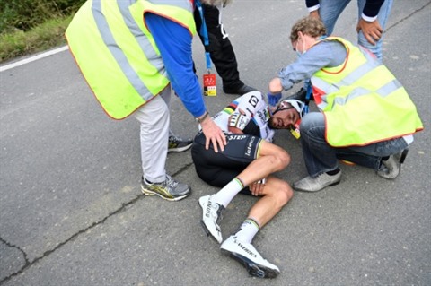 Mais, alors qu’il était isolé à l’avant avec le duo, le porteur du maillot arc-en-ciel est passé par dessus son vélo, retombant lourdement sur le dos, à la suite d’une collision avec une moto de l’organisation à 35 kilomètres de l’arrivée.