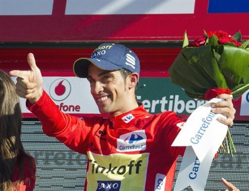 | Le nouveau maillot rouge Alberto Contador, à l'issue de la 10e étape du Tour d'Espagne, le 2 septembre à Borja. |