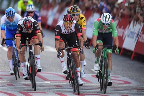 | Le Colombien Juan Sebastian Molano (au centre) a remporté la 21e et dernière étape de la Vuelta, le 11 septembre à Madrid. |