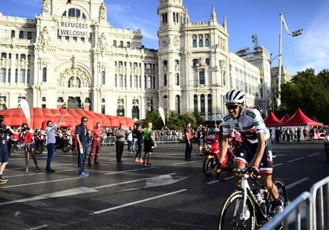 | Alberto Contador roule devant le palais Cibeles pour sa dernière course professionnele, la 21e étape de "La Vuelta", le 10 septembre. |