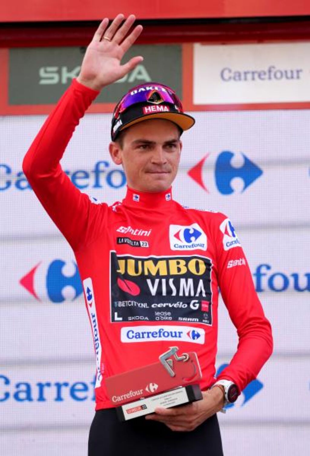 | L'Américain Sepp Kuss toujours maillot rouge de la Vuelta après la 12e étape, le 7 septembre à Saragosse. |
