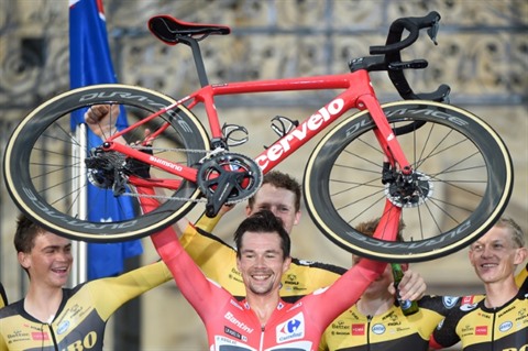 | Le Slovène Primoz Roglic, vainqueur du contre-la-montre décisif, rafle la victoire dans La Vuelta, le 5 septembre à Saint-Jacques-de-Compostelle. |