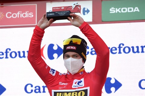 | Le coureur de la Jumbo Primoz Roglic nouveau maillot rouge de leader de la Vuelta, à l'issue de la 13e étape à Dumbria, le 3 novembre. |