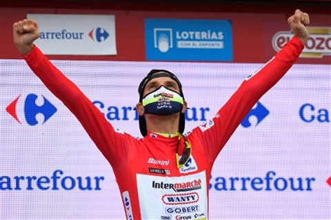| Le coureur estonien Rein Taaramäe (Intermarché-Wanty Gobert) avec le maillot rouge de leader du Tour d'Espagne après sa victoire sur la 3e étape, le 16 août. |