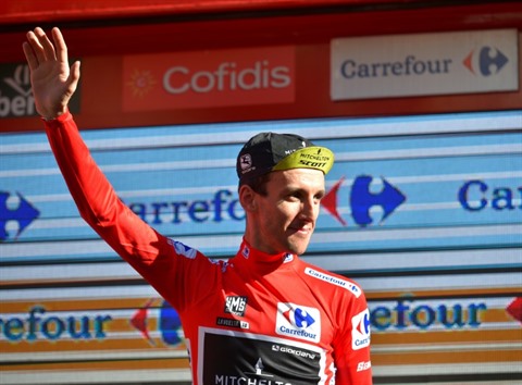 | Le maillot rouge de leader de "La Vuelta" toujours sur les épaules de Simon Philip Yates à l'issue de la 18e étape à Lérida, le 13 septembre. |