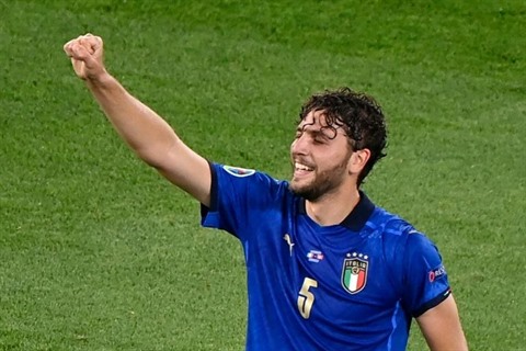 | La joie du milieu de terrain italien Manuel Locatelli, après avoir ouvert le score face à la Suisse, lors de leur match de poule à l'Euro 2020, le 16 juin au Stade Olympique à Rome. |