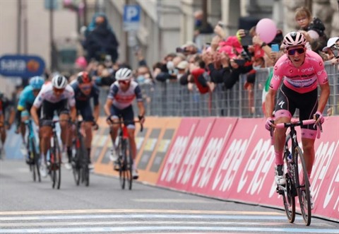 | Le Portugais Joao Almeida à l'arrivée de la 16e étape du Tour d'Italie, entre Udine et San Daniele, le 20 octobre. |