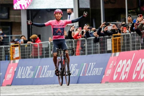 | Le leader colombien du Tour d'Italie, Egan Bernal, vainqueur en solitaire de la 16e étape à Cortina d'Ampezzo, le 24 mai. |