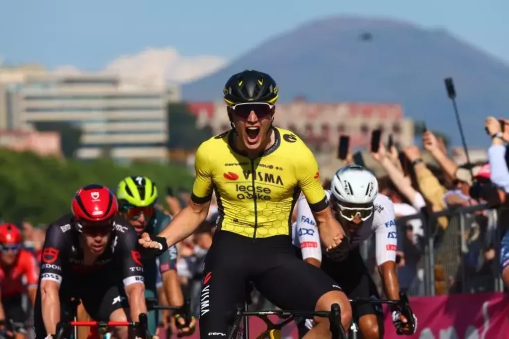 | Le Néerlandais Olav Kooij après sa victoire dans la 9e étape du Tour d'Italie le 12 mai à Naples. |