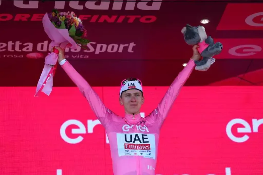 | Le Slovène Tadej Pogacar avec son maillot rose de leader du classement général du Tour d'Italie le 12 mai. |