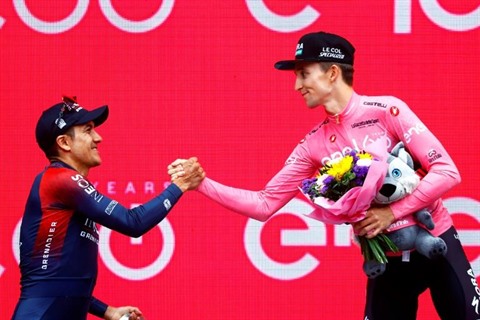 | L'Équatorien Richard Carapaz (gauche), 2e et vainqueur du Giro en 2019, félicite Jai Hindley, premier Australien à remporter le Tour d'Italie, le 29 mai à Vérone. |