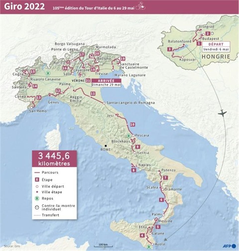 | Tracé du Tour d'Italie cycliste 2022, du 6 au 29 mai. |