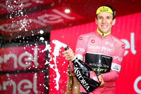 | Le Britannique Simon Yates leader du Giro, sur le podium à l'arrivée de la 16e étape, le 22 mai à Rovereto. |