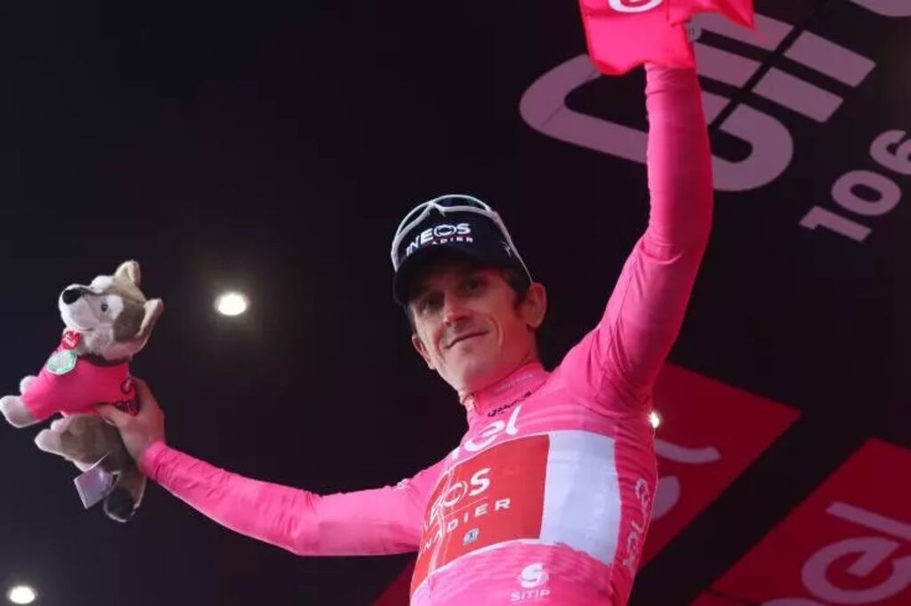 | Le coureur gallois d'Ineos-Grenadiers Geraint Thomas, leader du Giro, sur le podium après l'arrivée de la 19e étape du Tour d'Italie, le 26 mai à Tre Cime di Lavaredo. |