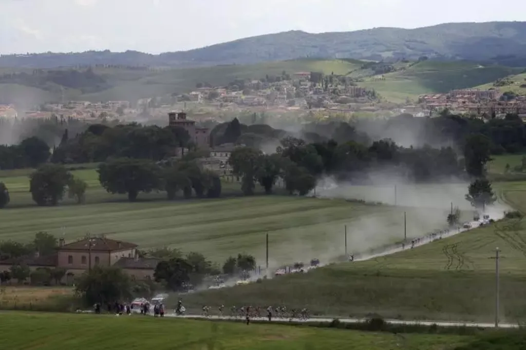 | Le peloton emprunte une portion des "chemins blancs", en graviers, lors de la 9e étape du Tour d'Italie, près de Sienne le 18 mai. |