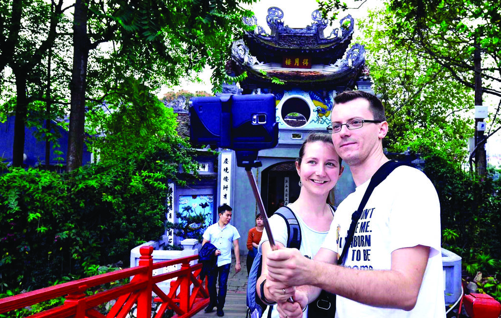 | Un couple de voyageurs étrangers prenant un selfie devant le temple de Ngoc Son, à Hanoï. |