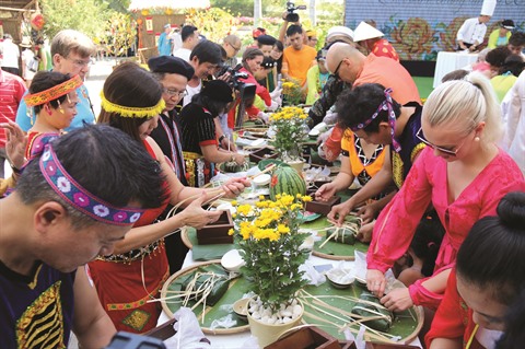 | Touristes apprenant à préparer des "bánh chung", gâteaux carrés de riz gluant, farcis de viande et de haricots, servis principalement lors du Têt traditionnel des Vietnamiens. |