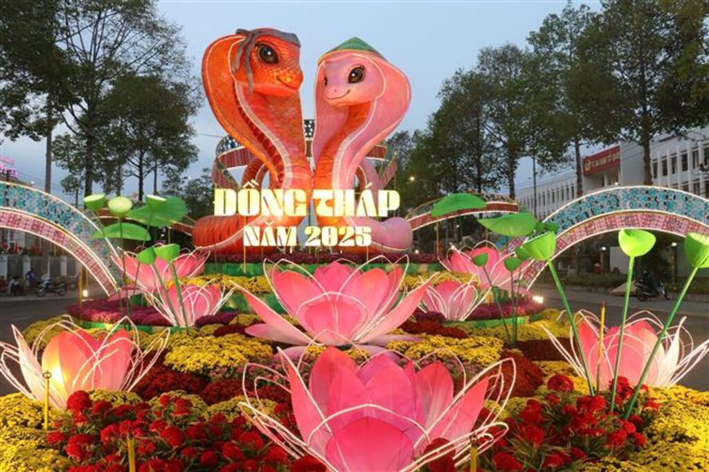 | Installations dans la rue florale de la province de Dông Thap lors du Têt 2025. |