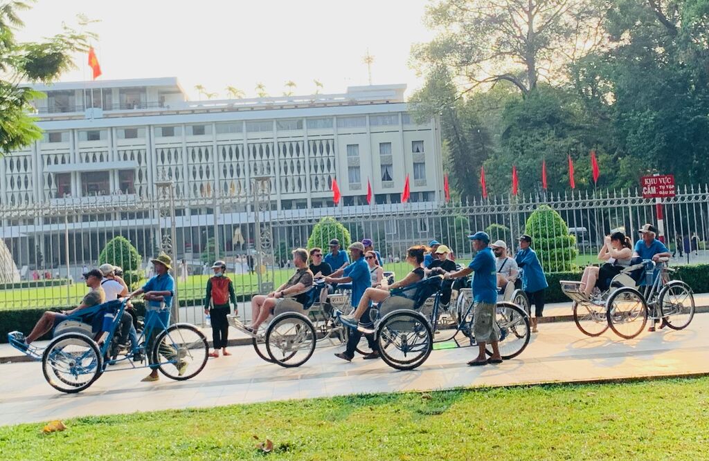 | Des touristes étrangers découvrant Hô Chi Minh-Ville à cyclo. |