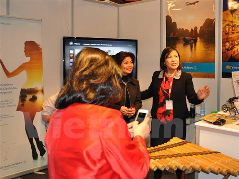 | L’ambassadeur du Vietnam en Norrvège, Mme Lê Thi Tuyêt Mai (droite), présente les potentiels touristiques du Vietnam à la foire touristique Reiselivsmessen, tenue à Oslo. |