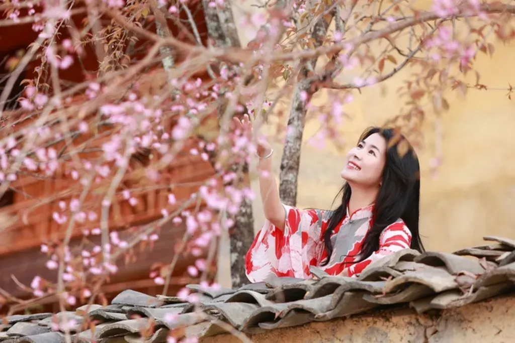 | Une touriste pose près des cerisiers du village de Lô Lô Chai, dans la commune de Lung Cú. |
