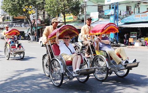 | Des visiteurs étrangers découvrent la ville de Dà Nang (Centre) en cyclo-pousse. |