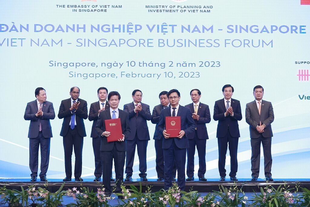 | Le Premier ministre Pham Minh Chinh (2e plan, centre) supervise l’échange des accords de coopération entre agences et entreprises du Vietnam et de Singapour. |