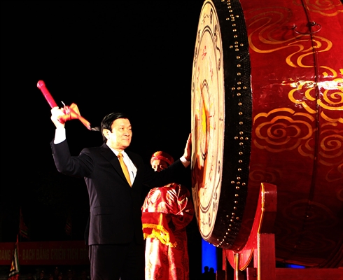 | Le président Truong Tân Sang frappe le tambour inaugurant le festival du temple |