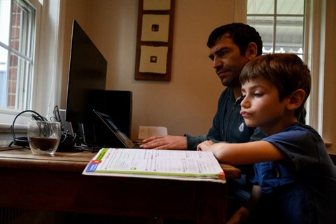 | Joachim, 8 ans, et son père Pierre-Yves, suivent les leçons en ligne, à Washington le 20 mars. |