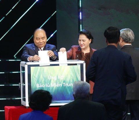 | Le Premier ministre Nguyên Xuân Phuc, la présidente de l’Assemblée nationale Nguyên Thi Kim Ngân font un don aux habitants du Centre qui ont été endommagés par les inondations. |