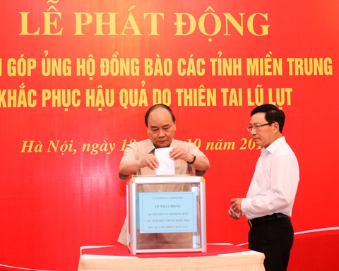 | Le Premier ministre Nguyên Xuân Phuc (gauche) et le vice-Premier ministre Pham Binh Minh (droite) au lancement de la mobilisation des fonds pour soutenir la population du Centre. |