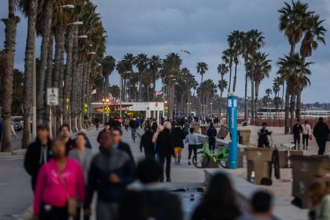 | Des promeneurs le long de la plage à Santa Monica, le 19 mars, 20 minutes après l'annonce du confinement par le gouverneur de Californie. |
