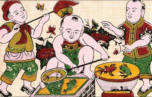 | S’amuser avec les poissons, une des peintures de Dông Hô la plus réputée, fabriquée par l’artisan Nguyên Huu Sam. |