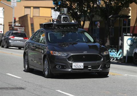 | Une voiture sans conducteur d'Uber dans une rue de San Francisco, en mars 2017. |