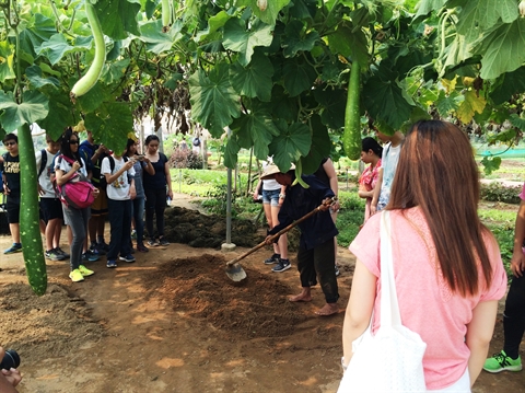 | Les élèves venant de Singapour cherchent à comprendre les techniques de culture à Trà Quê. |