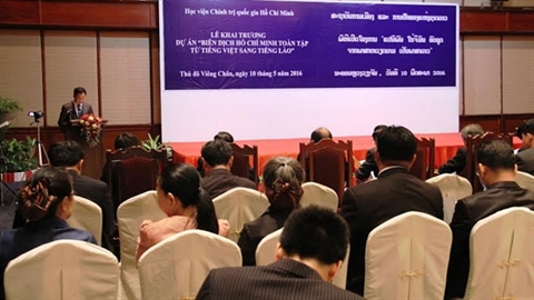 | La cérémonie de lancement le projet de traduction en lao des «Œuvres complètes du Président Hô Chi Minh», le 10 mai à Vientiane. |