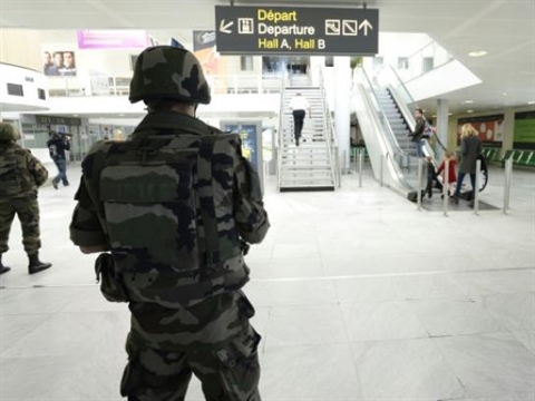 | Des soldats français patrouillent dans le cadre du plan Vigipirate dans l'aérogare de Mérignac, en Gironde, le 14 novembre. |