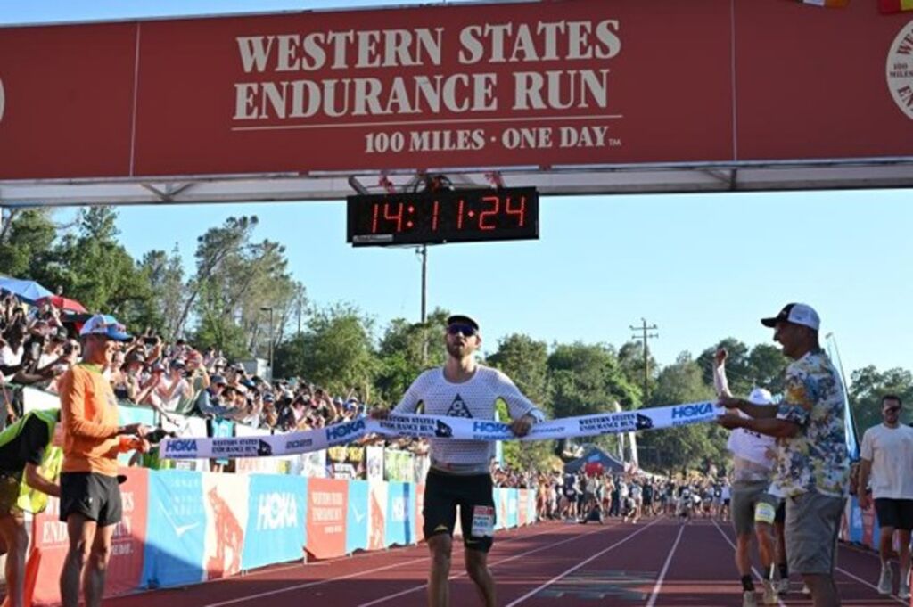 | Caleb Olson passe en vainqueur la ligne d'arrivée de la Western States 100, le 28 juin à Auburn (États-Unis). |